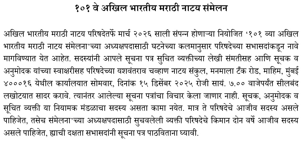 नमस्कार,अखिल भारतीय मराठी नाट्य परिषदेचे अध्यक्षपद मिळणे ही माझ्यासाठी अतिशय भाग्याची गोष्ट मी समजतो.